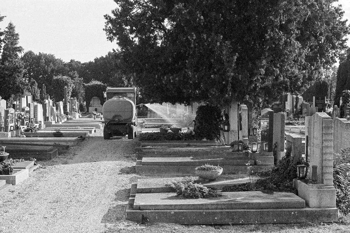 Aufgrund der extremen Hitze während der Sommermonate habe ich auf dem Friedhof in Wr. Neustadt nur wenige Runden gedreht. Die Unverzichtbarkeit von Wasser war deutlich sichtbar, um einen Ort am Leben zu erhalten, der für viele ein innerer Kern der Besinnung ist.